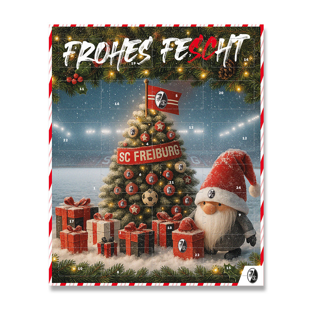 Öffne ab dem 01. Dezember jeden Tag ein Türchen unseres Adventskalenders und genieße ein Stück leckere Vollmilchschokolade! Dieses Jahr mit 24 leckere Schokoladenstückchen! Das schöne SC-Motiv zeigt das Europa-Park Stadion. Ein großes Sport-Club Freiburg Logo, sowie der Schriftzug "Fröhliche Weihnachten" befinden sich auch auf dem Motiv. Hinten sorgt ein kleines Loch dafür, dass der Kalender mithilfe eines Hakens oder Nagels an die Wand angebracht weihnachtliche Stimmung verbreiten kann.