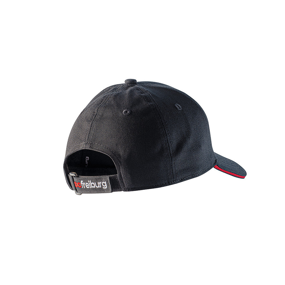 Design: Schwarze Cap mit großem SC Freiburg Logo-Stick auf der Vorderseite – mit integrierten, beweglichen Fußball-Motiven im Emblem.