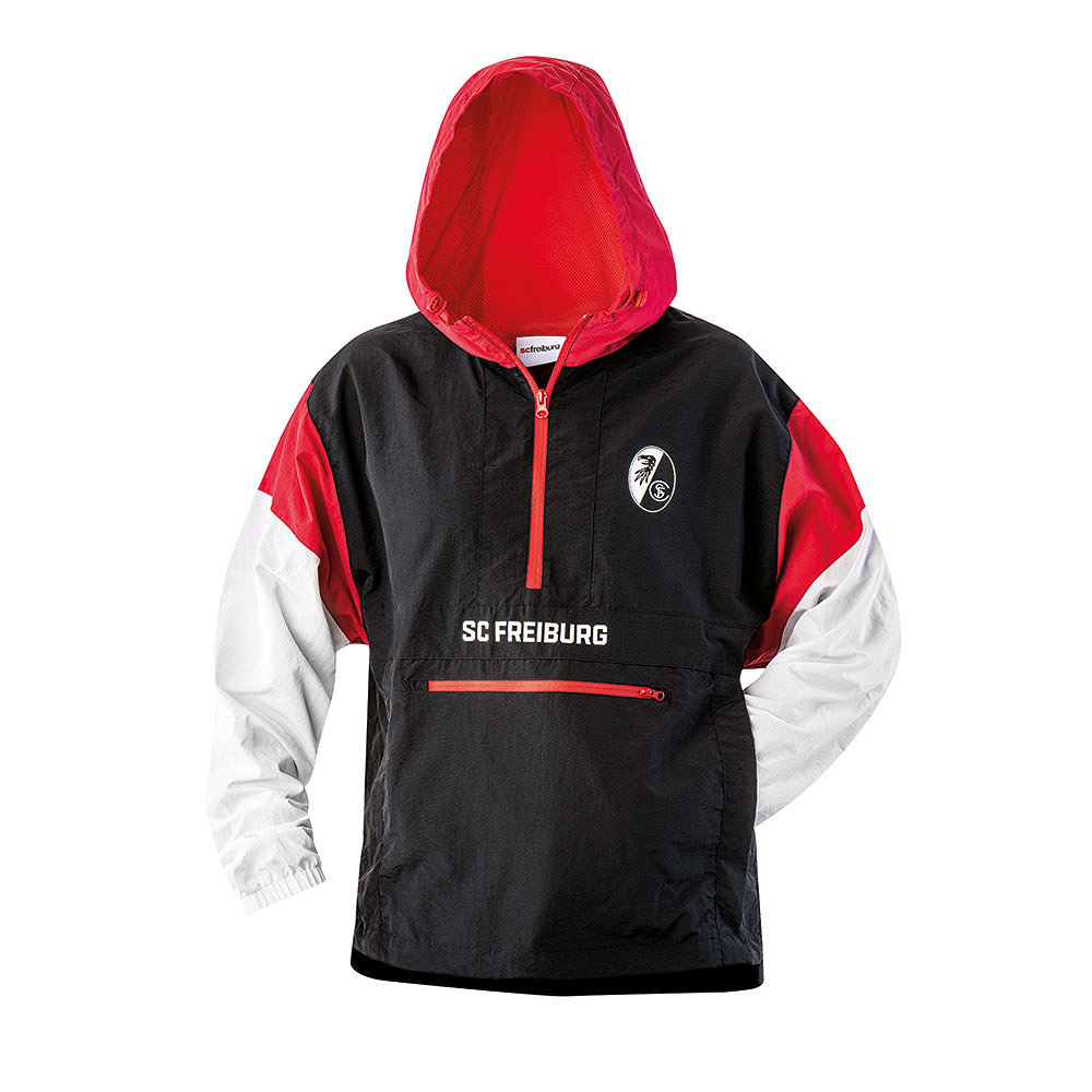 Sportlich, modern und absolut fan-tauglich: Der SC Freiburg Premium Anorak vereint stylisches Design mit praktischer Funktionalität. Mit seinem schwarzen Body, der auffälligen roten Kapuze und den rot-weißen Ärmeln sticht er sofort ins Auge und zeigt deine Verbundenheit zum Sport-Club.