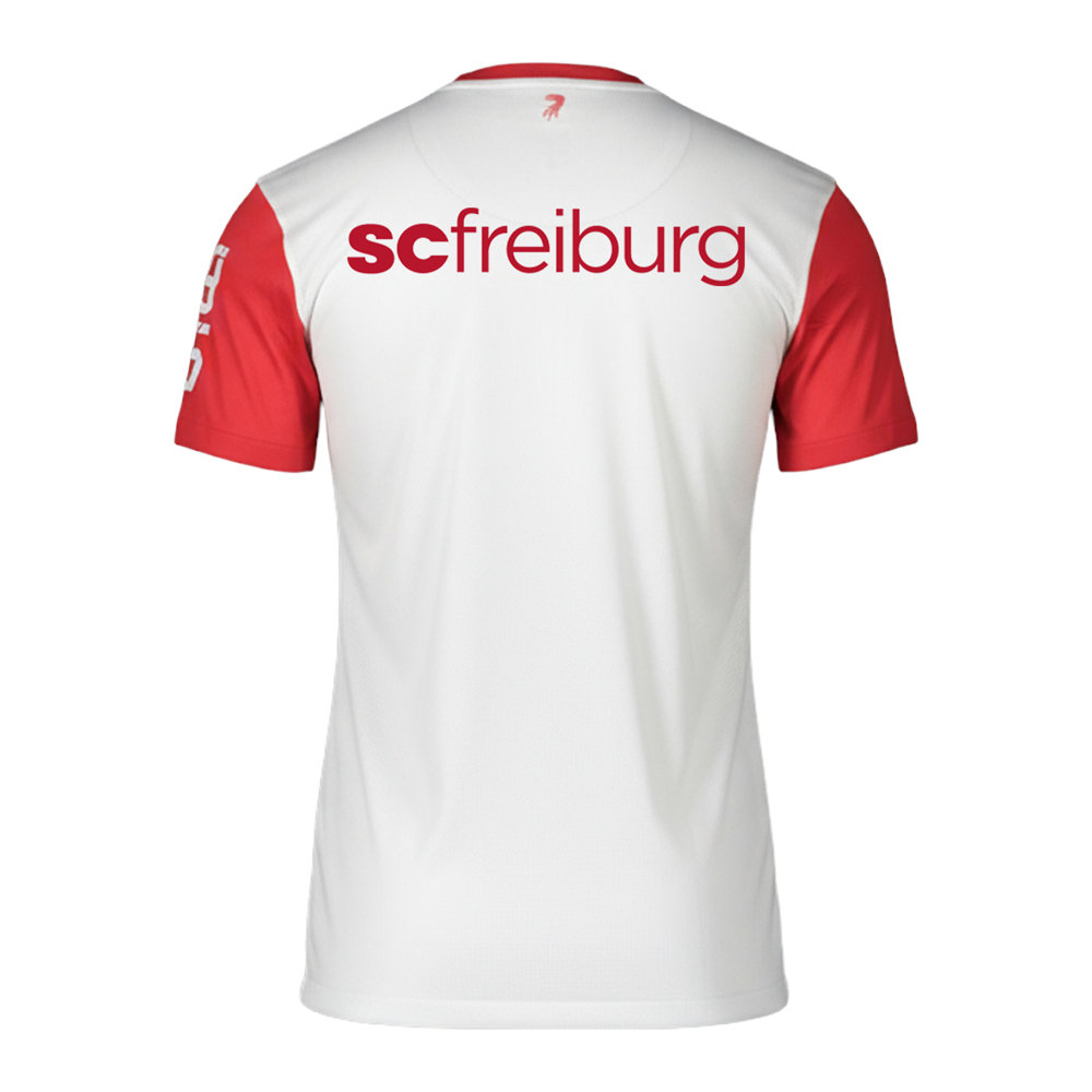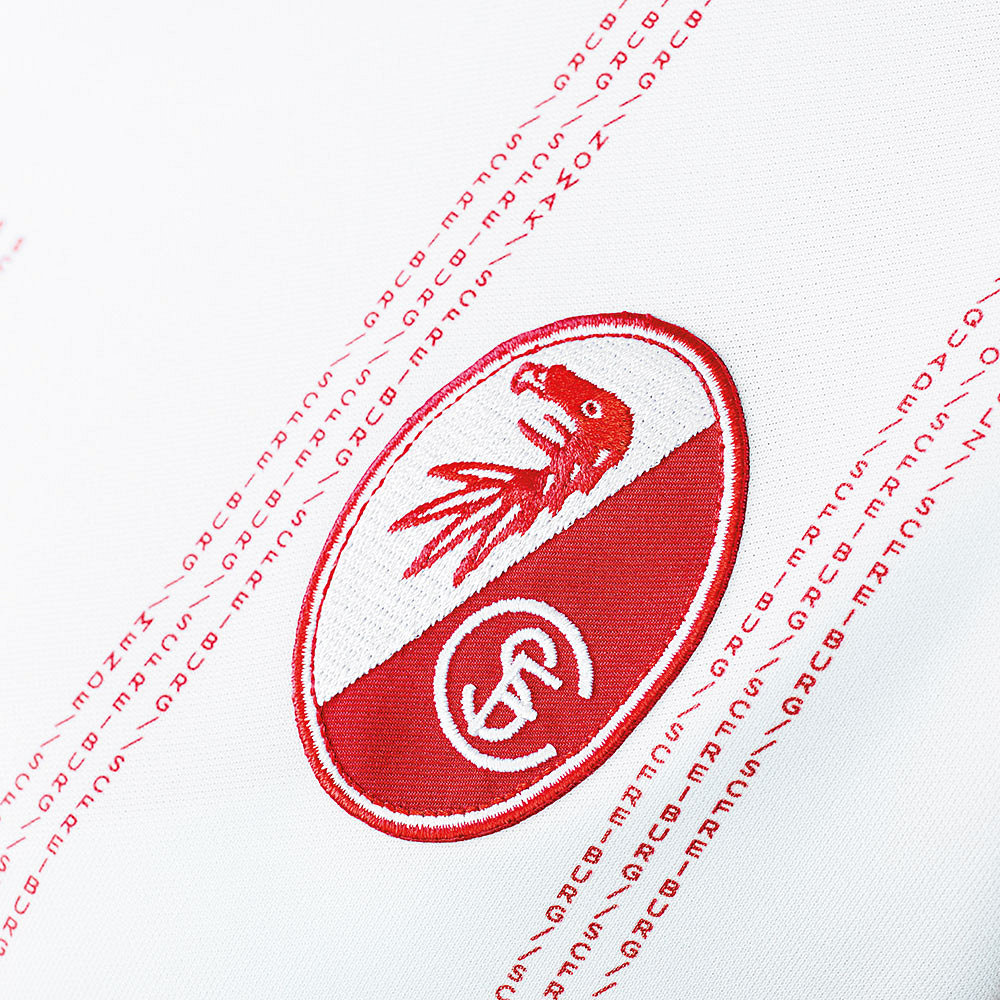 Besonders detailreich: Die roten Streifen, die entlang des Trikots verlaufen, bestehen aus den Namen aller Spielerinnen, die im Laufe der Vereinsgeschichte für den SC Freiburg aktiv waren. Das SC-Logo auf der linken Brustseite wurde farblich angepasst und erstrahlt in Rot-Weiß. Im Nacken rundet ein roter Greif das Design ab.