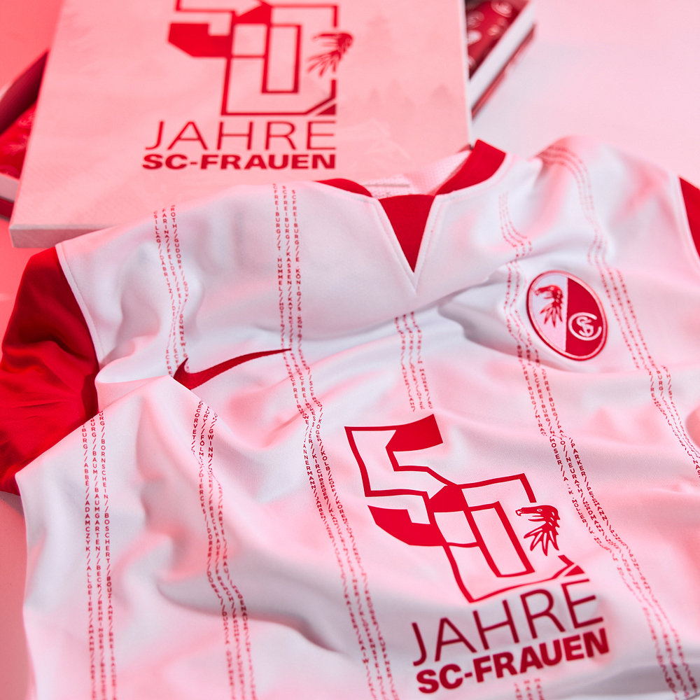 Das weiße Trikot mit roten Ärmeln und farblich abgesetztem roten Kragen ist ein echter Blickfang. Auf dem Ärmel erinnert ein Logo mit dem Gründungsjahr an die Geburtsstunde des Frauenfußballs beim Sport-Club. Auf der Vorderseite prangt zusätzlich das „50 Jahre SC-Frauen“-Logo.