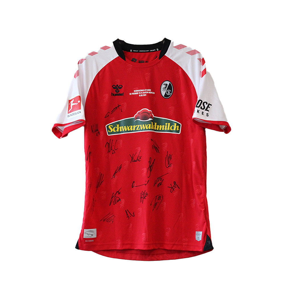 Dieses Heimtrikot, von unserem ehemaligen Ausstatter Hummel, stammt aus der Saison 2020/2021 und wurde in der Bundesligapartie SC Freiburg gegen den FC Bayern München von Janik Haberer getragen. Auf der Brust befindet sich die das Match mit Stadion und Datum aufgedruckt.